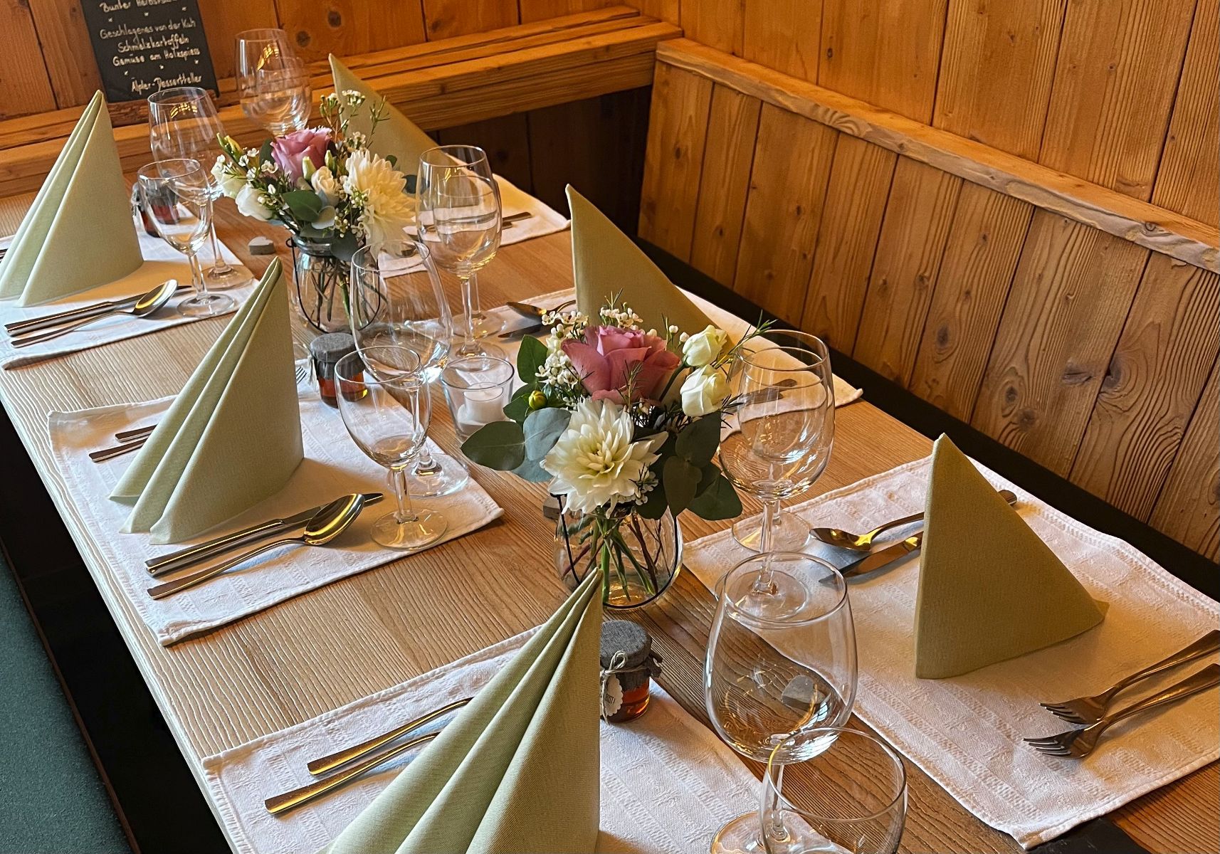 Von rustikal bis festlich gedeckt – die Gaststube bietet Platz für rund 60 Personen und ist das Herzstück der Alpwirtschaft Unterlauelen.